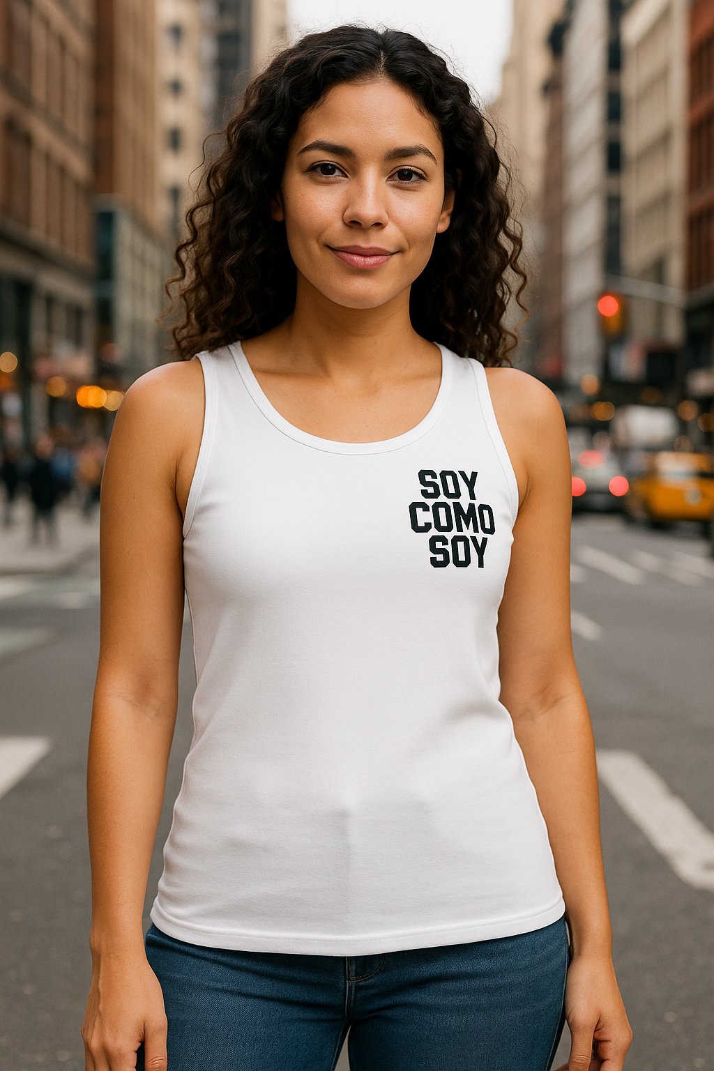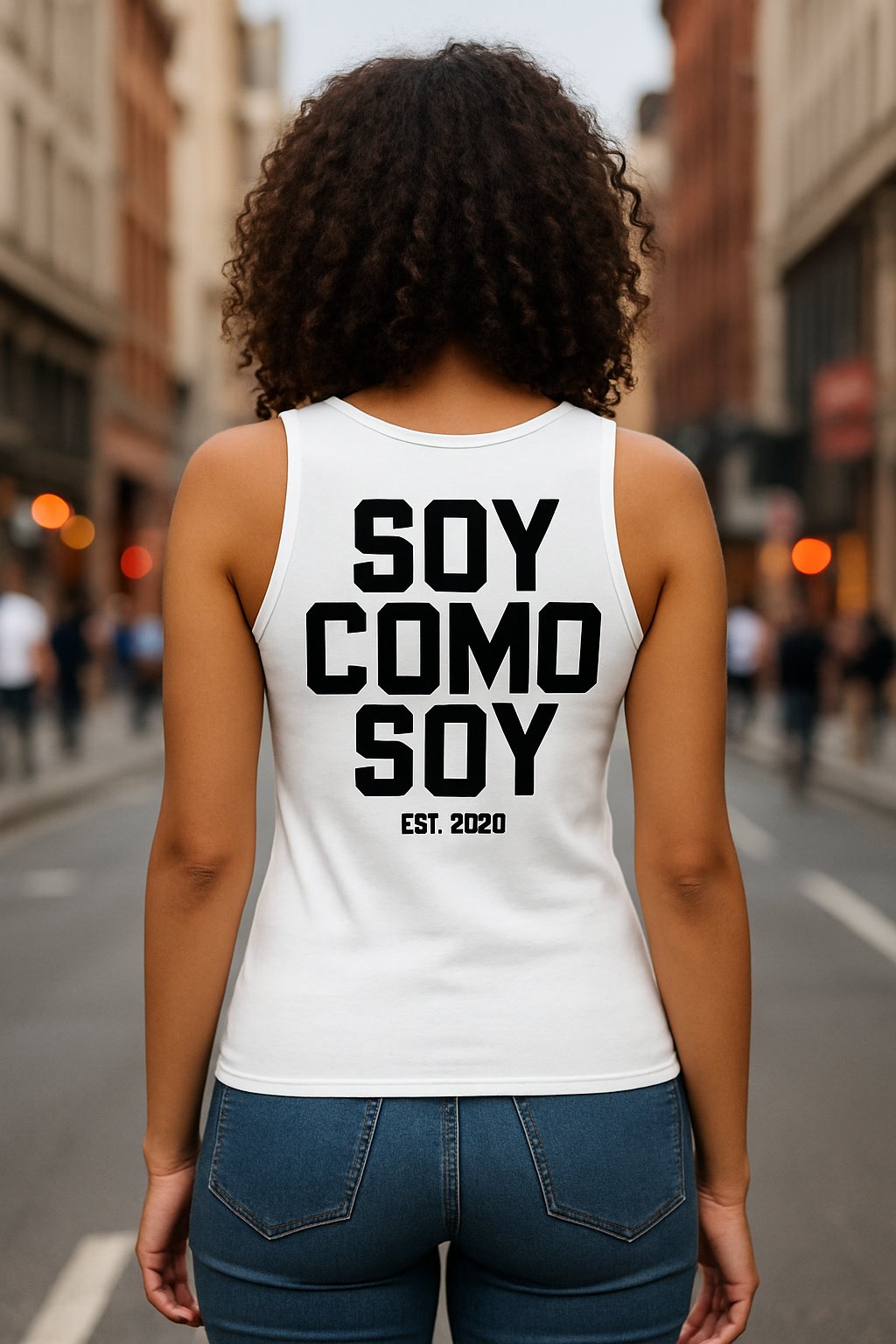 This women’s white tank top combines comfort, quality, and attitude in one versatile piece. Made from soft, breathable fabric, it’s perfect for everyday wear or dressing up your look. Featuring the bold statement "Soy Como Soy" on the front left chest and across the back , it’s more than just a top — it’s a declaration of authenticity and self-love. Wear it your way, because who you are is exactly enough.